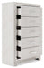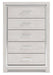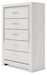 The epitome of fashion-forward design, this chest of drawers is a beautiful blend of style and luxury. Shiny chrome-tone accents, a pearlized finish and mosiac pulls bring a glam touch to the richly rustic appearance. Five smooth-gliding drawers provide plenty of storage space for your wardrobe needs.
